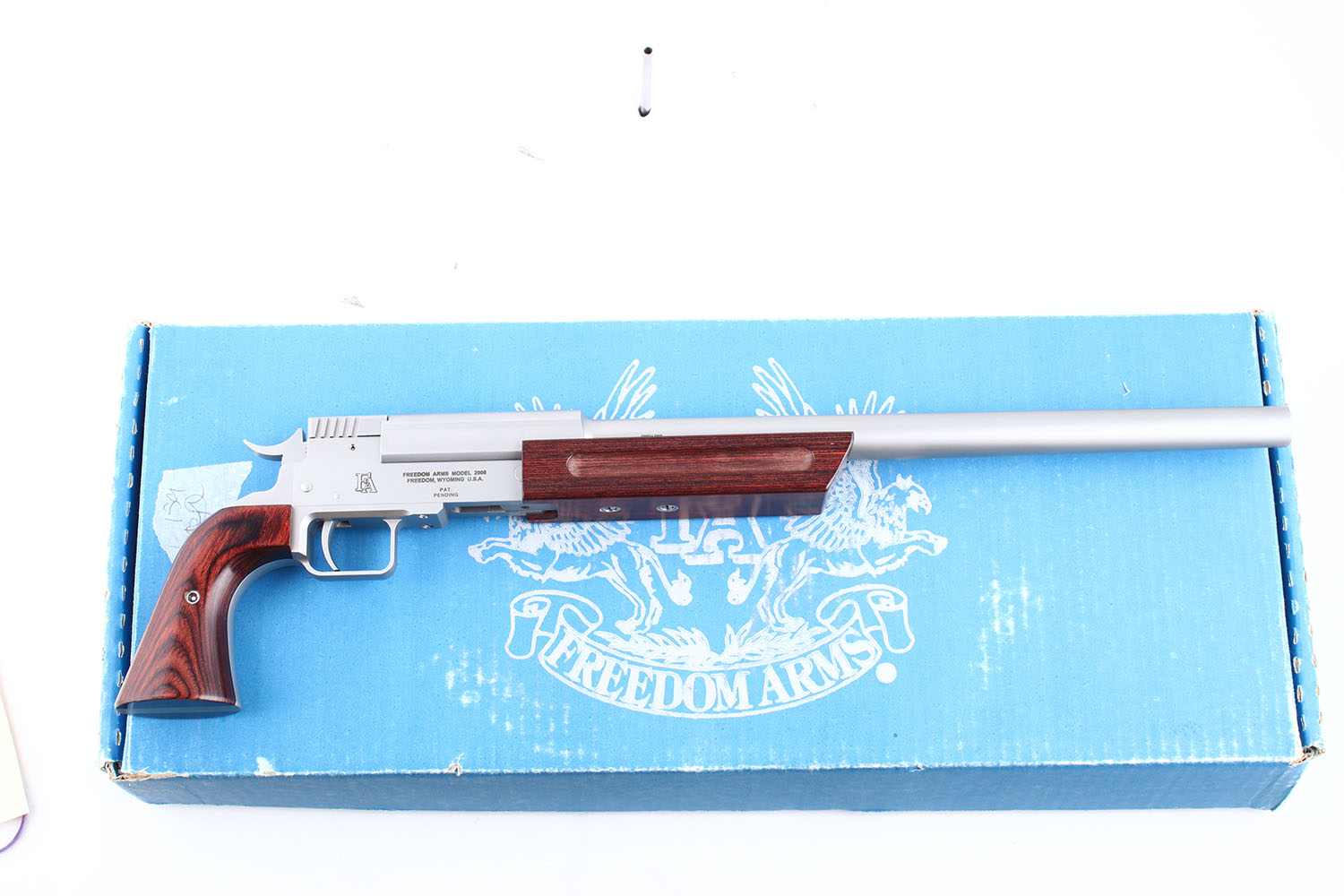 Freedom Arms, Model 2008, CAL: 6.5x55 Swede, MFG: Modern. SN: 08SH 002, Single Shot Tip Up, 16'' barrel. The wood grip and forend are in excellent condition with little to no visible wear. The matte gun metal grey finish on the gun is excellent with very little wear. Bores are excellent, bright with strong rifling. Mechanically very solid, seems to function well. No sights. Comes a Freedom Arms cardboard box with foam cut for this gun but a sticker listing a different model (1983). FFL Req. - Value: 1500 to 2000