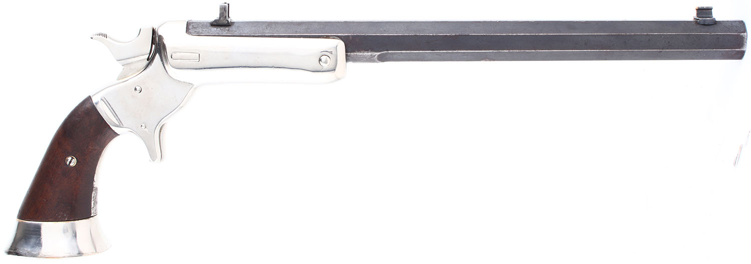 HISTORY: these mid to late 1800's target rifles were meant to be portable, light weight, and accurate. They have stocks that slide into a dovetail cut on the bottom of the grip and are secured by a screw in the back of the grip, this one was converted to a target pistol. These antique ''Pocket Rifles'' are specifically exempt from the NFA and do not require an SBR tax stamp even though they have a short barrel and a stock.