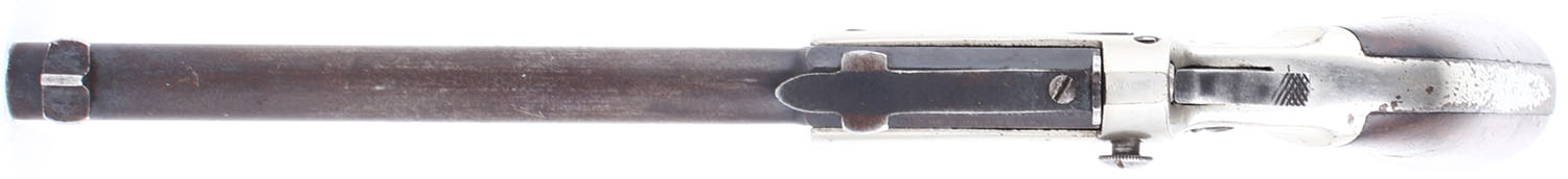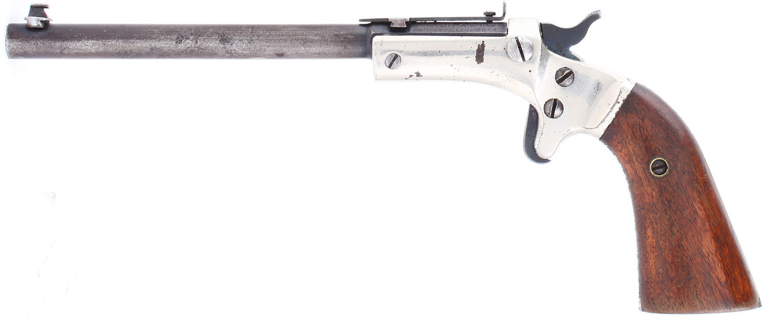 J. Stevens A&T Co., Model 43 Diamond Second Issue, CAL: 22 LR, MFG: 1896-1916. SN: 28116, Single Shot, 5 7/8'' barrel. The wood grips are in very good condition with some handling wear, and minor dings. The bluing on the barrel has worn thin and toned to a mix of brown patina and original blue with some exposed gun metal grey. Bore is good, the rifling thin and slightly darkened with even roughness and light pitting. Mechanically good, the hammer and trigger mechanism seems to work well. The barrel does get stiff when opened all the way and requires a little bit of force to start closing, likely just needs to be cleaned. Buckhorn sights, rear buckhorn sight and front post sight are set in dovetail cuts on the barrel. FFL or C&R Req. - Value: 200 to 600