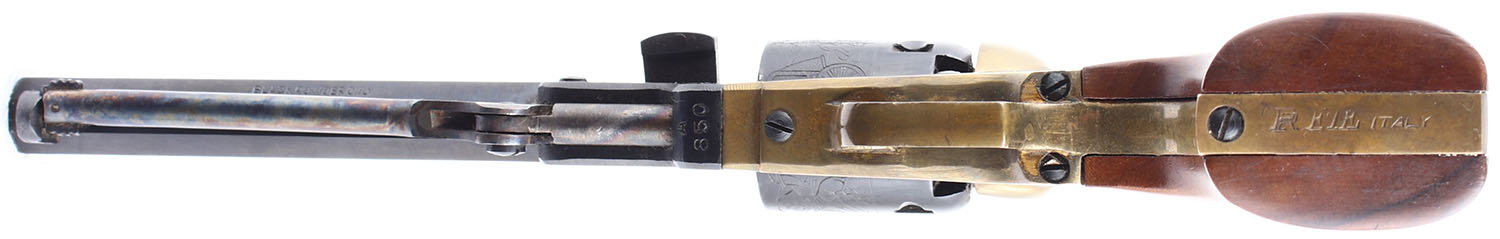 R.ETE, Copy of 1849 Pocket, CAL: .31, MFG: Modern, SN: A850, Percussion Muzzleloader, 6'' octagon barrel. The manufacturer's mark is on the butt, SN is on the bottom of the frame & there are proof marks on right side of the barrel & frame. The wood grips are excellent. There are minor handling marks to the finish. The metal blue finish on the barrel & cylinder rates 90% & the brass frame is excellent, with an aged patina. Case-hardened ram-rod & hammer. Stagecoach cylinder scene is visible. Bore is excellent. Brass cone front sight. Mechanical operation appears to function properly. Timing is correct & action is tight. Blackpowder, No FFL Req. - Value: 200 to 400