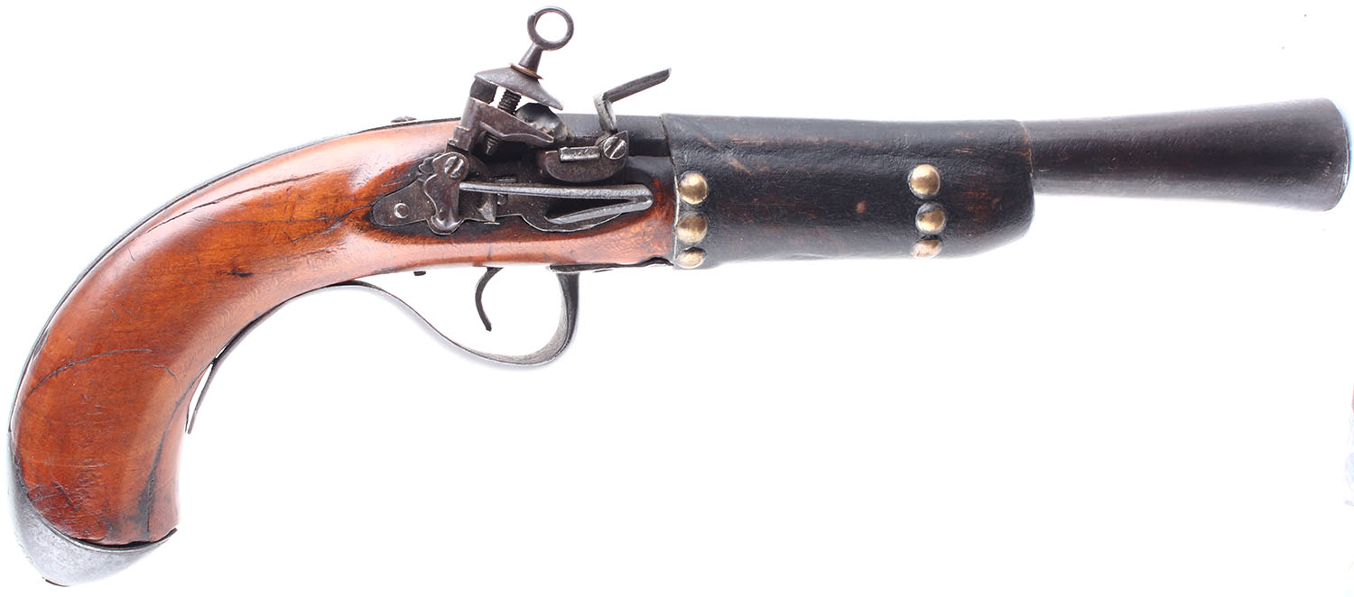 Mexican Colonial Trabuco Blunderbuss Pistol, CAL: appx 20GA, MFG: circa 1800's, SN: NONE, Flintlock Muzzleloader, 10'' barrel. HISTORY: In colonial Mexico, a Trabuco or blunderbuss pistol was a type of muzzle-loading firearm that served as an early form of a shotgun for close-quarters combat. The Trabuco blunderbuss pistol was considered effective for its intended purpose & gained a prominent place in colonial weaponry and historical narratives.