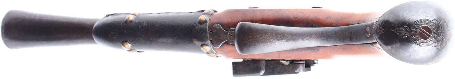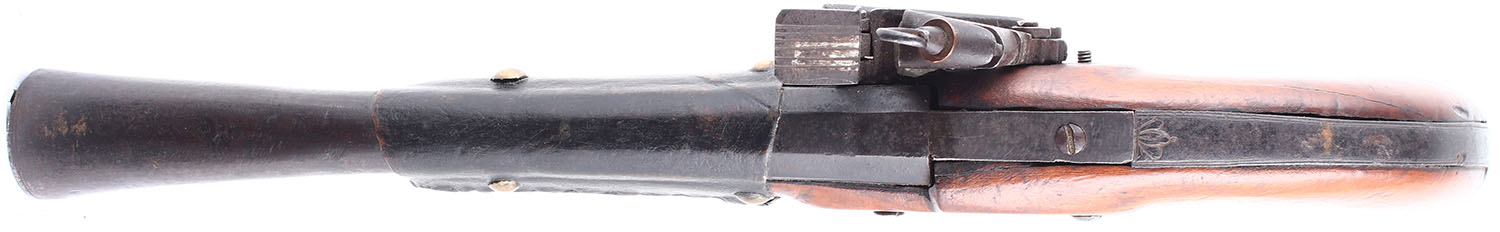CONDITION: The wood stock is good. There is a repaired break on the front strap, a few cracks, edge chips & other contusions/scrapes. There is an old piece of leather hide wrapped around the forend, held by brass tacks. The stock is curved in imitation of the Model 1804 Spanish Pistol. The miquelet lock & metal components have fully toned to a smooth brown patina, with intermittent pitting. Bore is fair, dark & rough. No sights. Rather crude construction. Antique, No FFL Req. - Value: 1000 to 2000