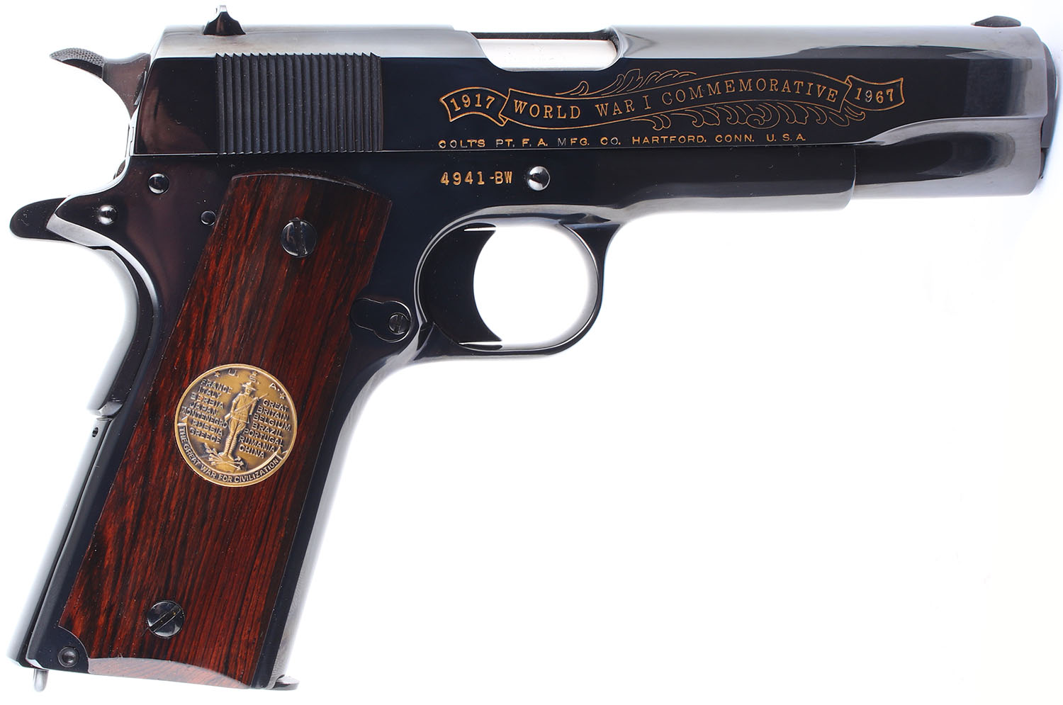 ''Colt .45 Auto'' is engraved on the tops of the barrels. All the engravings on the slides and frames are filled with a gold toned finish. The right sides of the frames are engraved with the serial numbers. The right sides of the slides are engraved with banners reading ''1917 World War I Commemorative 1967'', underneath the banners there is text that reads ''Colt's PT. F. A. MFG. Co. Hartford Conn. U.S.A.''. Each WWI 1911 is engraved with a battle scene on the left side of the slide that matches its case. There is also a Rampant Colt behind the slide serrations on each gun. These pistols are all in excellent or near excellent condition.