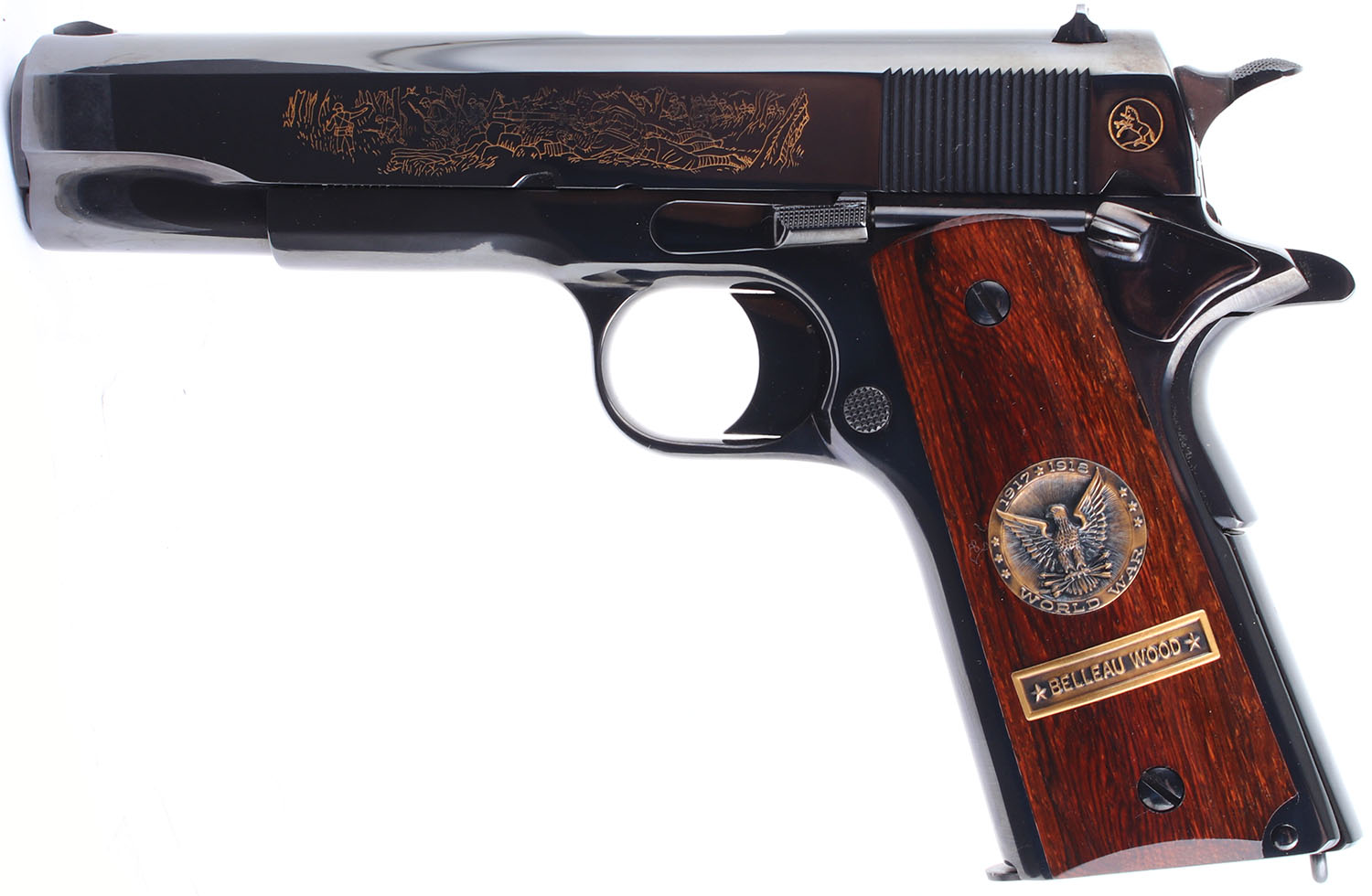 The WWI 1911's all have a blued finish and wood grips holding custom medallions. The medallion on the right grip panels have a depiction of a soldier with a rifle standing atop a hill with markings reading ''U.S.A.'' above the soldier with ''France Italy Serbia Japan Montenegro Russia Greece Great Britain Belgium Brazil Portugal Rumania (sic) China'' on either side, and a banner reading ''The Great War For Civilization'' below. The left grip panels have a medallion with an eagle with ''1917-1918'' marked above and ''World War'' below. There are small straight placards below the medallions on the left grip panels that mark the names of the battles the guns commemorate.