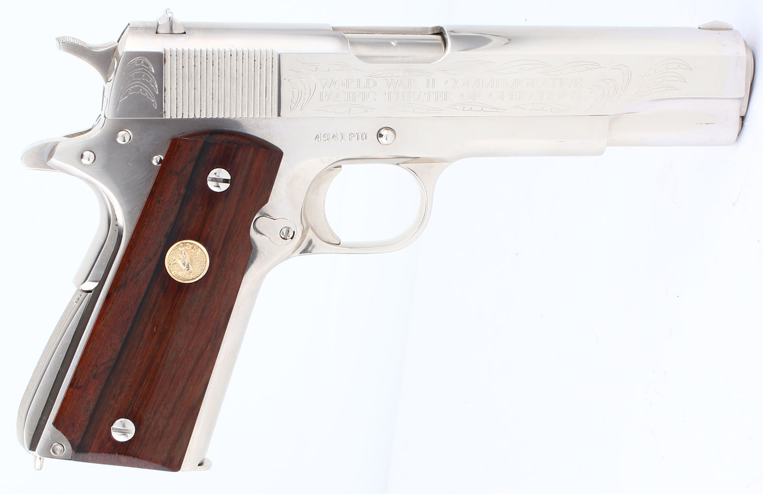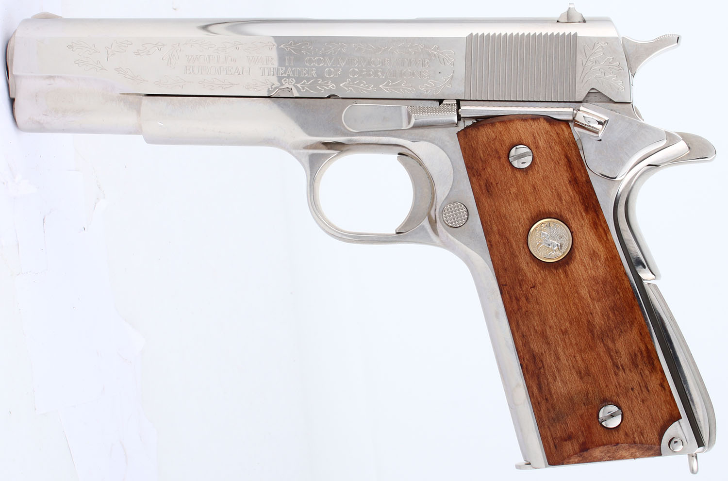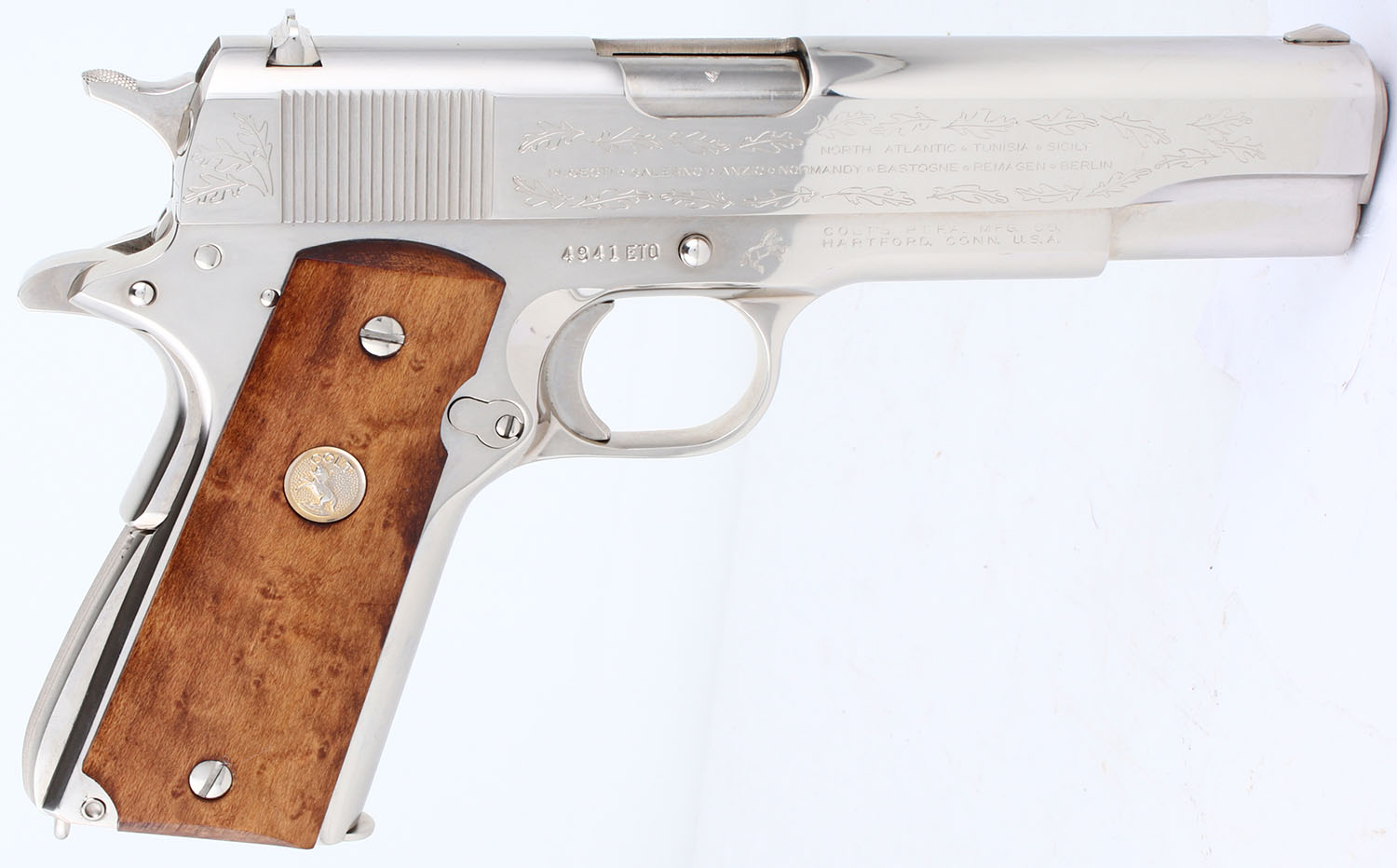 The WWII 1911 A1 pistols have wood grips with Colt medallions. They are nickeled and engraved. The engravings on the European Theatre 1911 A1 are as follows: ''Colt .45 Auto'' is engraved on the top of the barrel. The right side of the frame is engraved with the serial number, a Rampart Colt, and text reading ''Colt's PT. F. A. MFG. Co. Hartford Conn. U.S.A.''. The right side of the slide has engravings reading ''North Atlantic, Tunisia, Sicily, Ploesti, Salerno, Anzio, Normandy, Bastogne, Remagen, Berlin''. The left side of the slide has engravings that read ''World War II Commemorative European Theatre of Operations''. There are floral engravings on both the left and right side of the slide.