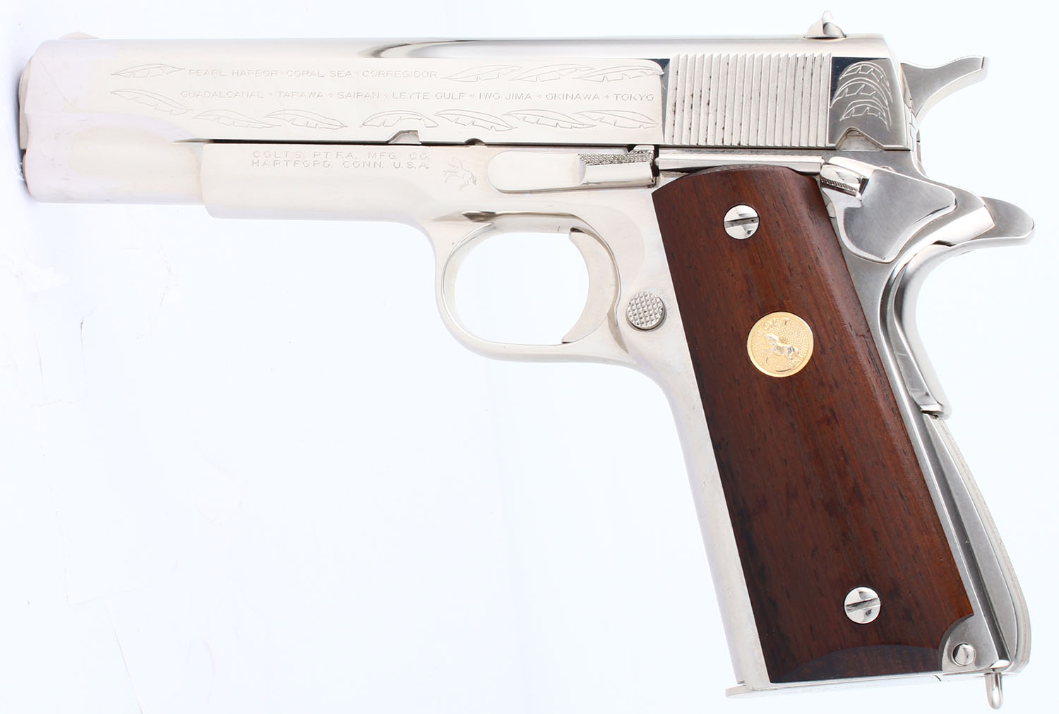 The engravings on the Pacific Theatre 1911 A1 are as follows: ''Colt .45 Auto'' is engraved on the top of the barrel. The right side of the frame is engraved with the serial number. The left side is engraved with a Rampant Colt, and text reading ''Colt's PT. F. A. MFG. Co. Hartford Conn. U.S.A.''. The left side of the slide has engravings reading ''Pearl Harbor, Coral Sea, Corregidor, Guadalcanal, Tarawa, Spain, Leyte Gulf, Iwo Jima, Okinawa, Tokyo''. The right side of the slide has engravings that read ''World War II Commemorative Pacific Theatre of Operations''. There are floral engravings on both the left and right side of the slide.