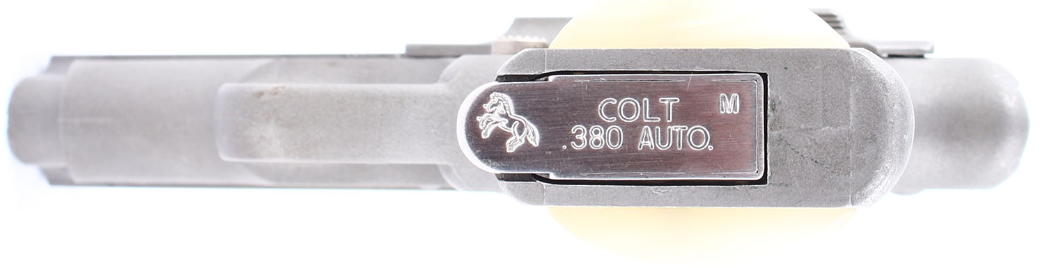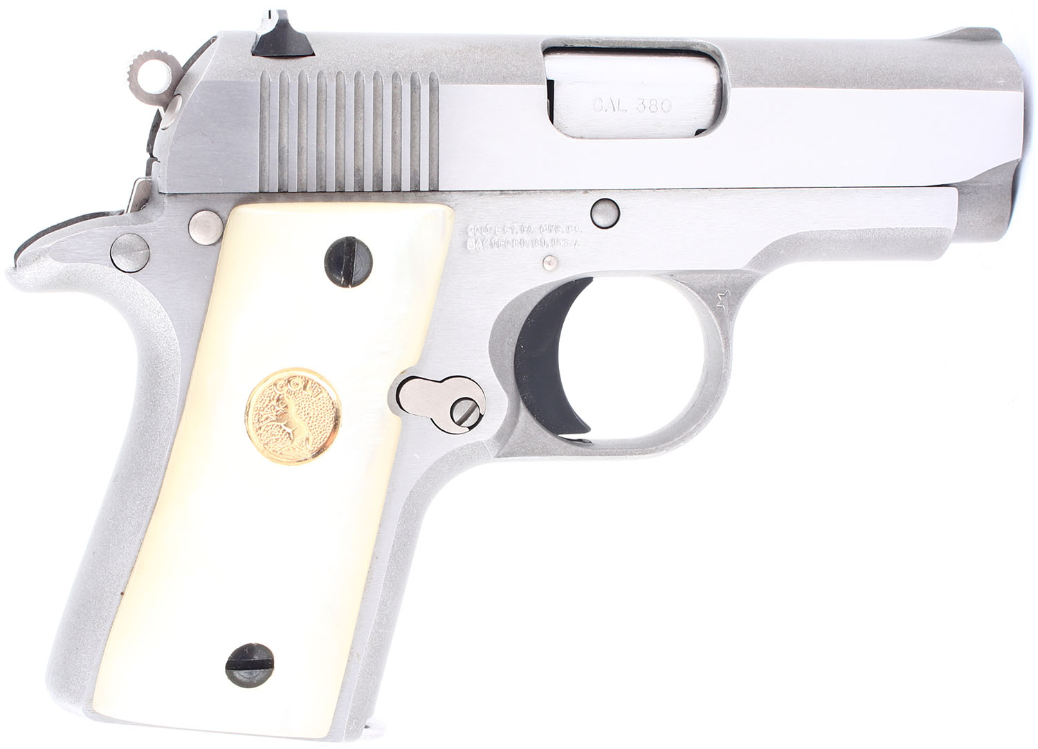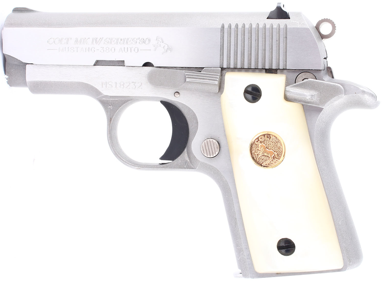 Colt, MK IV Series 80 Mustang, CAL: 380 ACP, MFG: Modern, SN: MS18232, Semi Auto Pistol, single action only. 2 1/2'' barrel. Colt medallion synthetic pearl grips are in excellent condition. The stainless steel finish on the frame and slide rate 99%. Bore is excellent. Mechanically solid with very little side to side play in the slide. The front sight is integral to the slide, the rear sight is set in a dovetail cut on the slide. Comes in a generic soft pistol case with two magazines. FFL Req. - Value: 500 to 1000