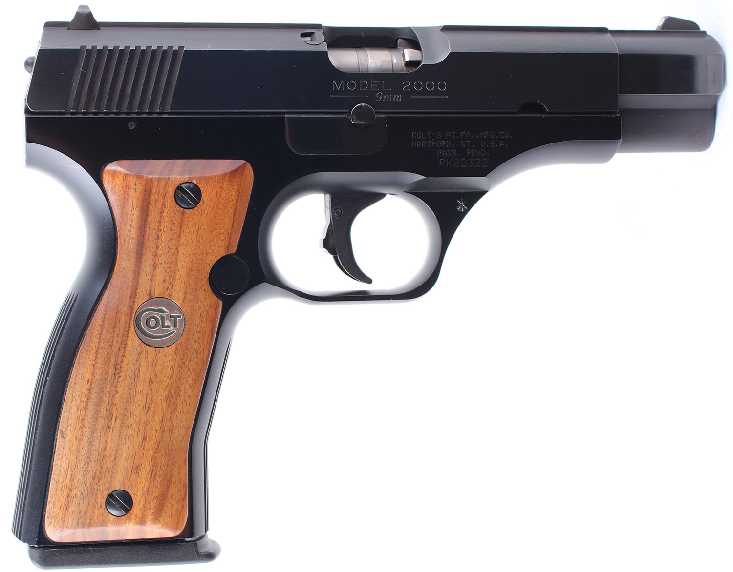 CASED Colt, 2000 All American First Edition, CAL: 9x19mm, MFG: 1991, SN: RK02322, Semi Auto Pistol, double action only. 4 1/2'' barrel. Factory wood grips with colt medallion are in excellent condition. The blued finish on the frame and slide rates 99%. Bore is excellent. Mechanically solid with little to no side to side play in the slide. 3 dot white combat sights, front sight is integral to the slide, rear sight is set in a dovetail cut in the slide. Comes in the factory case with two magazines, speed loader, cleaning brush, and owners manual. FFL Req. - Value: 600 to 1200