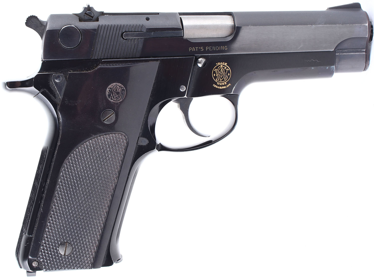 BOXED Smith & Wesson, 59, CAL: 9x19mm, MFG: 1974-75, SN: A241787, Semi Auto Pistol. 4'' barrel. Checkered plastic grips are in very good condition with slight handling wear and some rust in the grip screws. The black finish on the frame rates 97%, and slide rates 98%. Bore is excellent. Mechanically solid with very little side to side play in the slide. Blacked out sights, front serrated post sight is integral to the slide, windage adjustable black rear sight is set into a dovetail cut. Comes in a factory box with two magazines, cleaning rod and brush, and users manual. FFL or C&R Req. - Value: 300 to 600