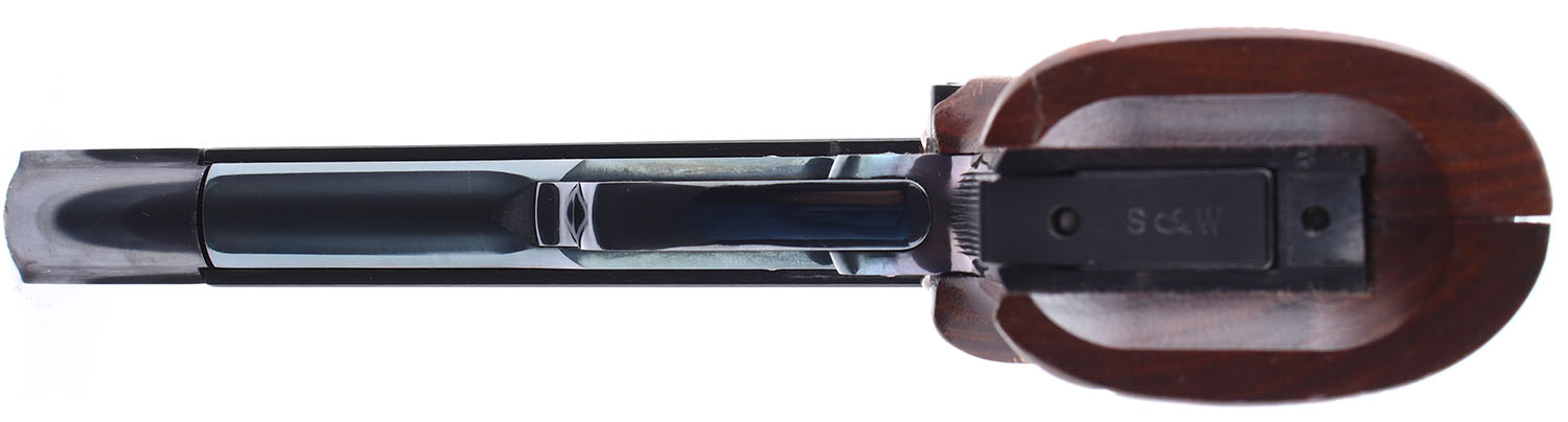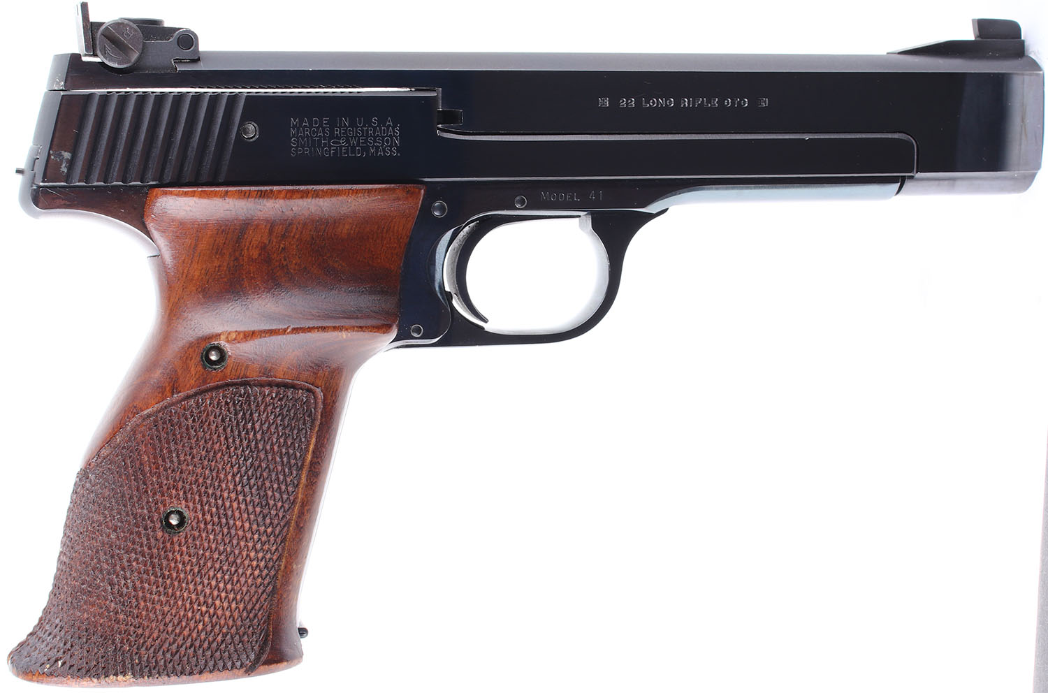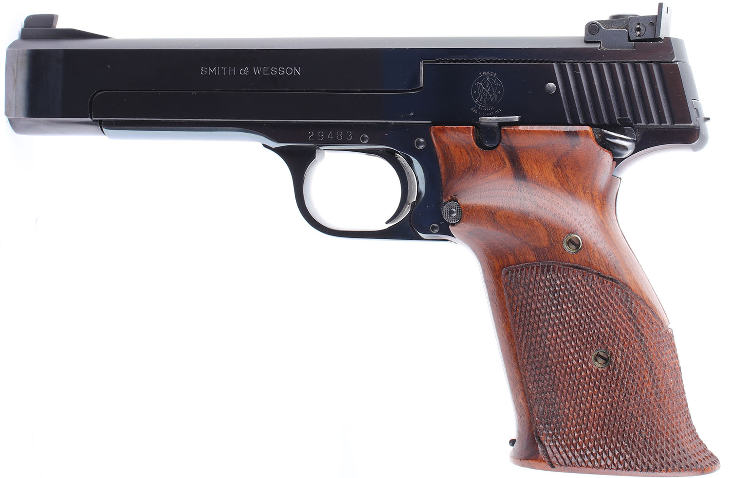 Smith & Wesson, 41, CAL: 22 LR, MFG: 1957-70, SN: 29483, Semi Auto Pistol. 5 1/2'' barrel. Checkered wood grips are in very good condition with some handling wear. The blued finish on the frame and slide rates 98%. Bore is excellent. Mechanically solid with some side to side play in the slide. Blacked out target sights, front serrated sight is integral to the slide, windage and elevation adjustable black rear sight is set into a dovetail cut. With one magazine. FFL or C&R Req. - Value: 700 to 1400