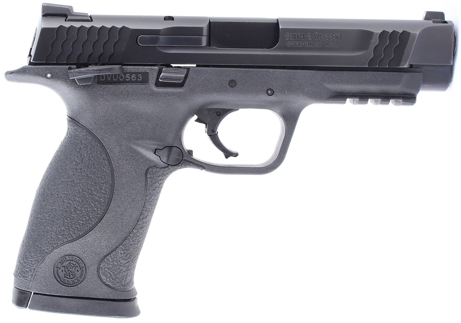 CASED Smith & Wesson, M&P45, CAL: 45 ACP, MFG: Modern, SN: DVU0563, Semi Auto Pistol. 4 1/2'' barrel. The textured plastic grip frame is in excellent condition with some wear. The black finish on the slide rates 99%. Bore is excellent. Mechanically solid with very little side to side play in the slide. 3 dot white combat sights, both front and rear sights are set into dovetail cuts, the rear sight has a set screw. Comes in a factory plastic hard case with five 10 round magazines, two extra back straps, and a lock. FFL Req. - Value: 300 to 500