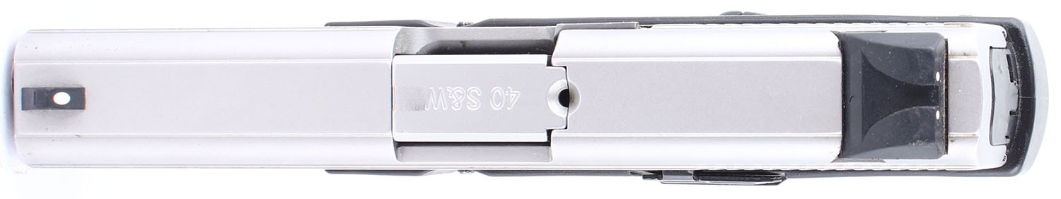 Smith & Wesson, SW40VE, CAL: 40 SW, MFG: Modern, SN: RAN6696, Semi Auto Pistol. 3 3/4'' barrel. The textured plastic grip frame is in excellent condition with some wear. The stainless finish on the slide rates 99%. Bore is excellent. Mechanically solid with very little side to side play in the slide. 3 dot white combat sights, front sight is pinned to the slide, rear sight is set into a dovetail cut. Comes with one 14 round magazine. FFL Req. - Value: 100 to 300