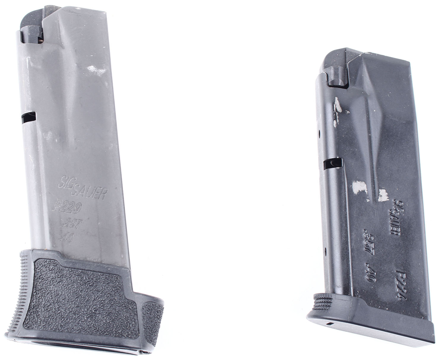 CASED Sig Sauer, P224, CAL: 40 SW, MFG: Modern, SN: 50E004765, Semi Auto Pistol. 3 1/4'' barrel. The textured plastic grips are in excellent condition with some wear. The black finish on frame rates 97%, and the stainless finish on the slide rates 94% with some wear including some scratches on the top of the slide in front of the rear sight. Bore is excellent. Mechanically solid with very little side to side play in the slide. 3 dot white combat sights, front and rear sights are set into dovetail cuts. Comes in the factory hard plastic case with a chamber flag, one ten round magazine, two extended 12 round magazines, and an owners manual. FFL Req. - Value: 500 to 1100