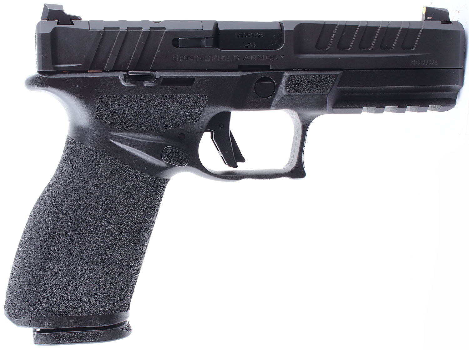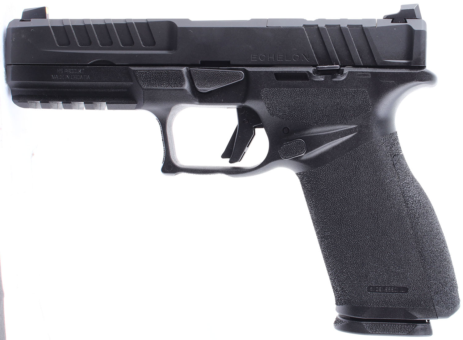 BOXED and CASED Springfield Armory (Croatia), Echelon, CAL: 9x19mm, MFG: Modern, SN: BE320024, Semi Auto Pistol. 4 1/2'' barrel. The checkered polymer grip frame is in excellent condition with light handling wear. The finish on the slide rates 98% and has very little handling wear. Bore is excellent. Mechanically solid, like new. Factory U notch rear sight and high vis front night sight, slide is optics ready. Comes in the factory box and soft pistol case with one 17 round magazine, one 20 round magazine, a three round extension for the 17 round magazine, a speed loader, two extra backstraps, optics screws and pins, an owners manual and other related paperwork. FFL Req. - Value: 400 to 600