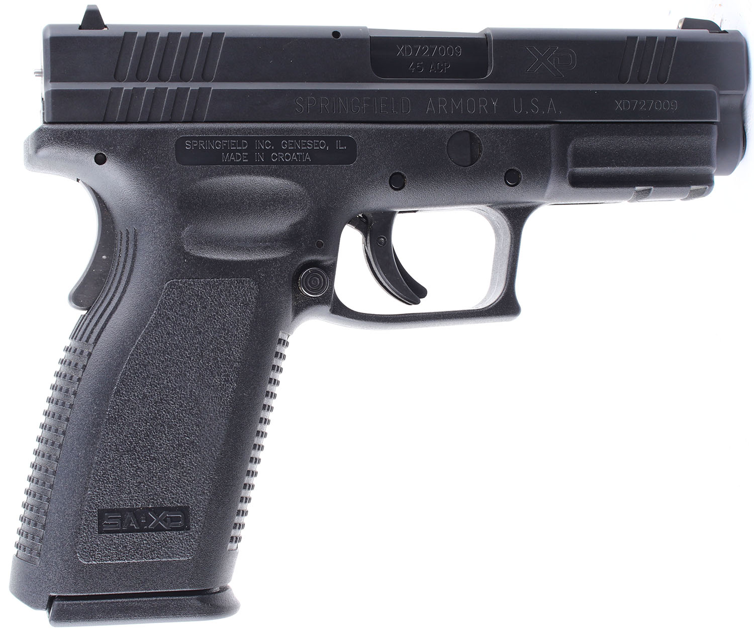 Springfield Armory, XD - 45 ACP, CAL: 45 ACP, MFG: Modern, SN: XD727009, Semi Auto Pistol. 4'' barrel. The plastic grip frame is in excellent condition. The black finish on the slide rates 98% with slight wear. Bore is very good, the grooves between the rifling are darkening. Mechanically solid with very little side to side play in the slide. 3 dot white combat sights are set in dovetail cuts. With two 13 round magazines. FFL Req. - Value: 200 to 500