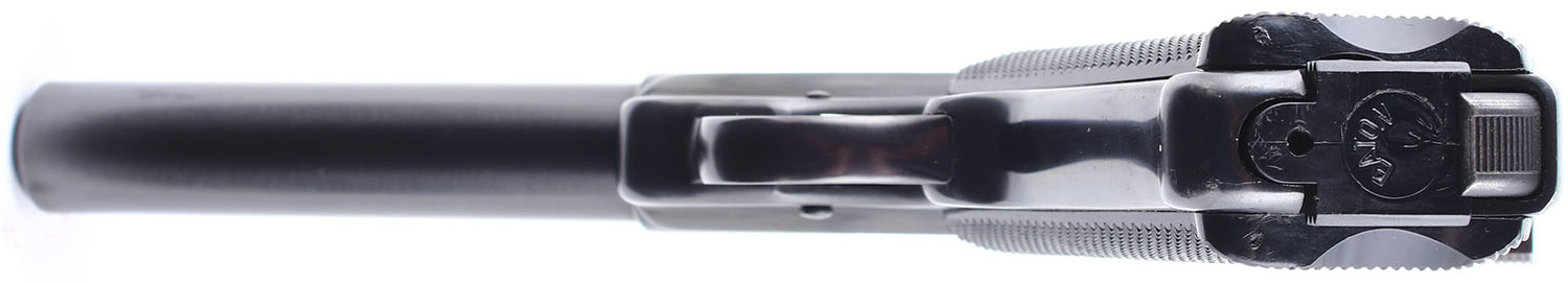 BOXED Ruger, Mark II Target, CAL: 22LR, MFG: 1988, SN: 214-48406, Semi Auto Pistol. 5 1/2'' barrel. The checkered plastic grips are in excellent condition with slight patina on the grip screws. The frame and slide rate 97%, there are a few small splotches of rust on the finish of the slide and frame. Bore is excellent. Mechanically solid. Blacked out target sights, front sight is screwed to the top of the barrel, the rear windage and elevation adjustable sight is set in a dovetail cut on the barrel. Comes in the factory box, with the protective outer box, two magazines, an owners manual, and other related paperwork. FFL Req. - Value: 250 to 500