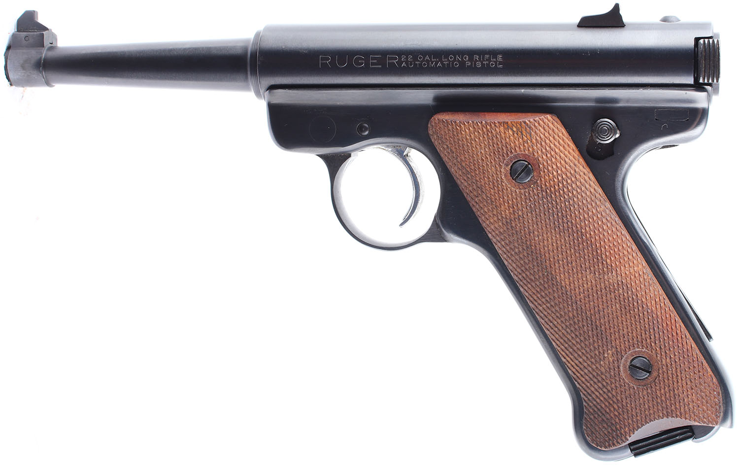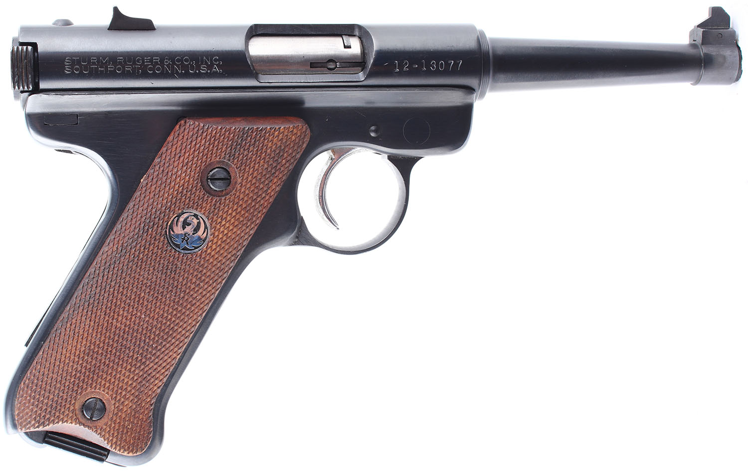 Ruger, Standard, CAL: 22LR, MFG: 1973, SN: 12-13077, Semi Auto Pistol. 4 3/4'' barrel. The checkered wood grips are in very good condition with some handling wear. The finish on the barrel and frame rates 98% and has slight handling wear. Bore is excellent. Mechanically solid. Blacked out target sights, the front sight is pinned into a notch on the front of the barrel, the rear sight is set in a dovetail cut on the barrel. Comes with one magazine. FFL or C&R Req. - Value: 250 to 500