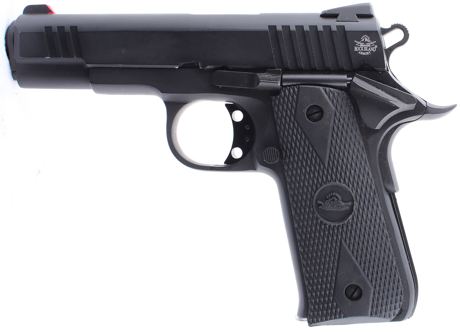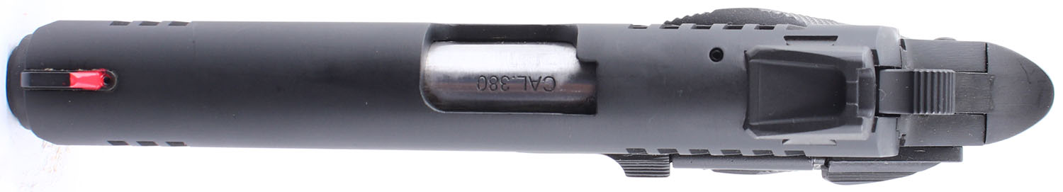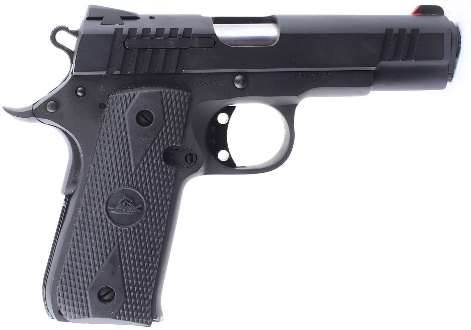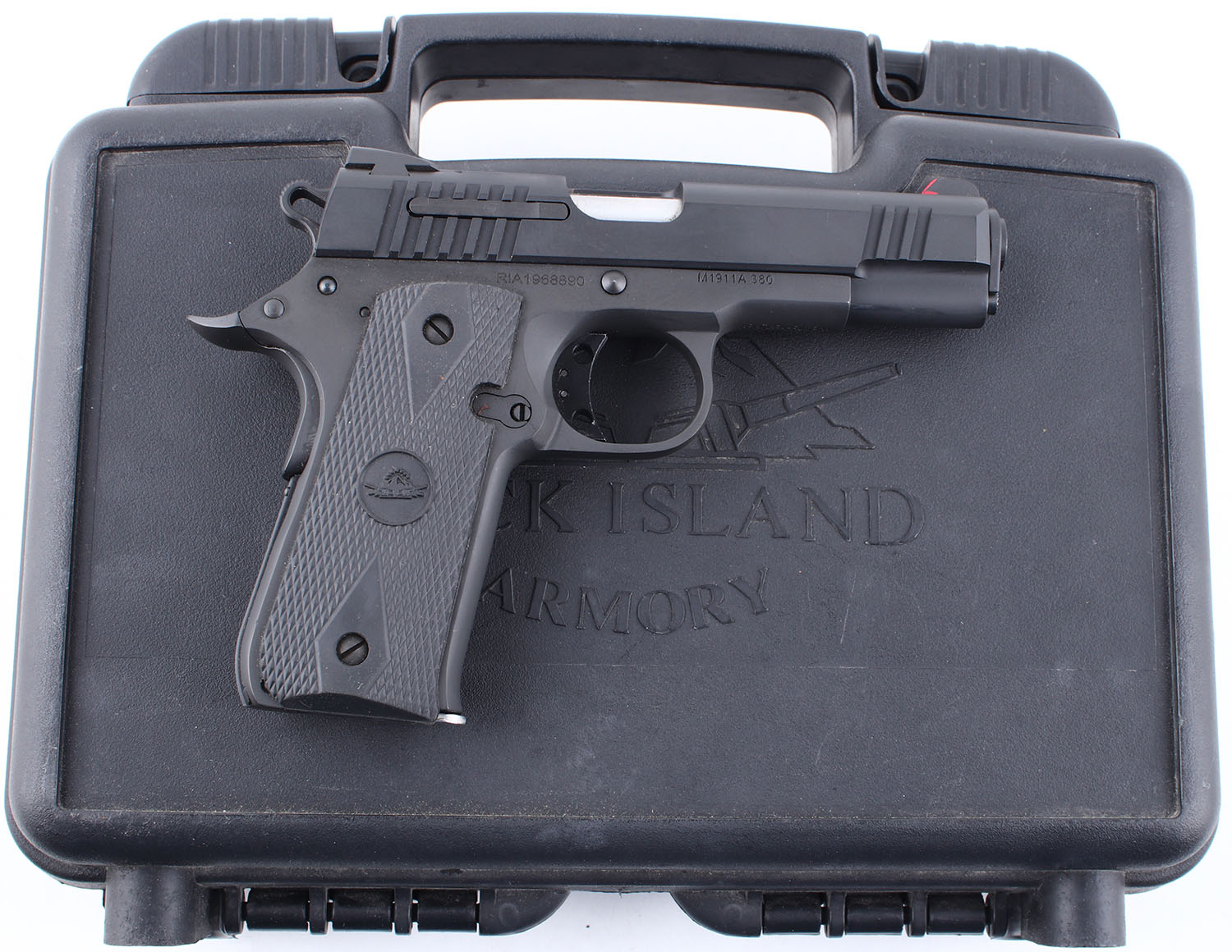 CASED Rock Island Armory (Philippines), M1911 A380 BBR, CAL: 380 ACP, MFG: Modern, SN: RIA 1968890, Semi Auto Pistol. 3 3/4'' barrel. Original checkered rubber grips are in excellent condition. The black finish on the frame and slide rates 98%. Bore is very good, slightly darkened. Mechanically solid with some side to side play in the slide. Blacked out sights, front sight is set into a dovetail cut and has red nail polish on it, black rear sight is set into a dovetail cut, it is slightly loose and can be pushed to either side. Comes in a factory hard plastic case with 5 magazines, a lock, inspection certificate and users manual. FFL Req. - Value: 250 to 400
