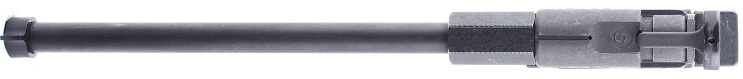Space Age Control, Survival Gun, CAL: 22LR (or flares), MFG: 1970s, SN: 1116, single shot pistol. 6 1/2'' barrel. The grey finish on the grip, barrel, and trigger assembly rates 98% with some wear. Bore is very good, darkened, with very light even roughness. Mechanically solid. Front sight is integral to a band affixed to the end of the barrel, rear sight notch is cut into the top of the trigger assembly.