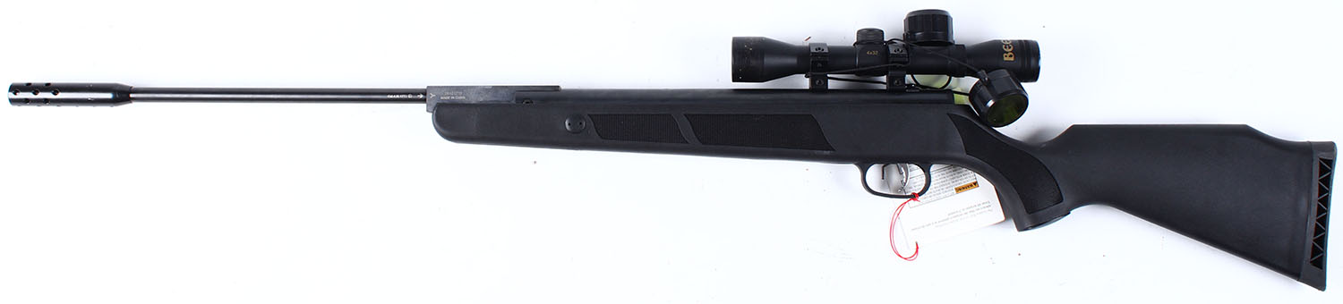 Beeman Precision, Model Sportsman RS2 Series Pellet, CAL: 4.5mm or .177, MFG: Modern, SN: NA, Break Barrel Pump, 20'' barrel. Promoted as accurate for up to 10-meter target shooting. The Model RS 2 advanced technology of the gas ram system uses compressed gas in a sealed, self-contained unit that is designed to replace the mainspring in a conventional air rifle. The air rifles cock like any other barrel-cocking airgun, but the single cocking stroke compresses a cylinder of gas instead of a mainspring. When the trigger is pulled, the compressed gas expands & drives the piston forward. The checkered & flat pistol grip, all-weather synthetic stock is excellent. The metal blue finish rates excellent. Bore is excellent. Fitted with a Beeman 4X32 scope. Stock is fitted with a ventilated recoil pad. Bore is excellent. Hang tag. Overall excellent. No FFL Req. - Value: 150 to 300