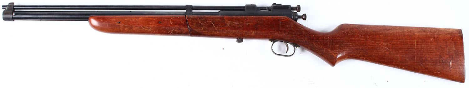 Challenger Arms Corp., Model Plainsman Pneumatic Rifle Pellet, CAL: .22, MFG: unknown SN: 141985, Pump Pneumatic, 20'''' barrel. Swinging forearm multi pump pneumatic, with knurled knob action. The semi pistol grip wood stock is very good, with lots of minor to small scrapes, scratches & contusions. The metal blue finish rates very good, with some spotting. Bore is very good. Missing the rear sight, but has the blade front sight. Stock manufactured without buttplate, but has several names scratched into the buttend. Does not appear to hold compression. These seem to be fairly rare & collectible. Overall good. No FFL Req. - Value: 20 to 100