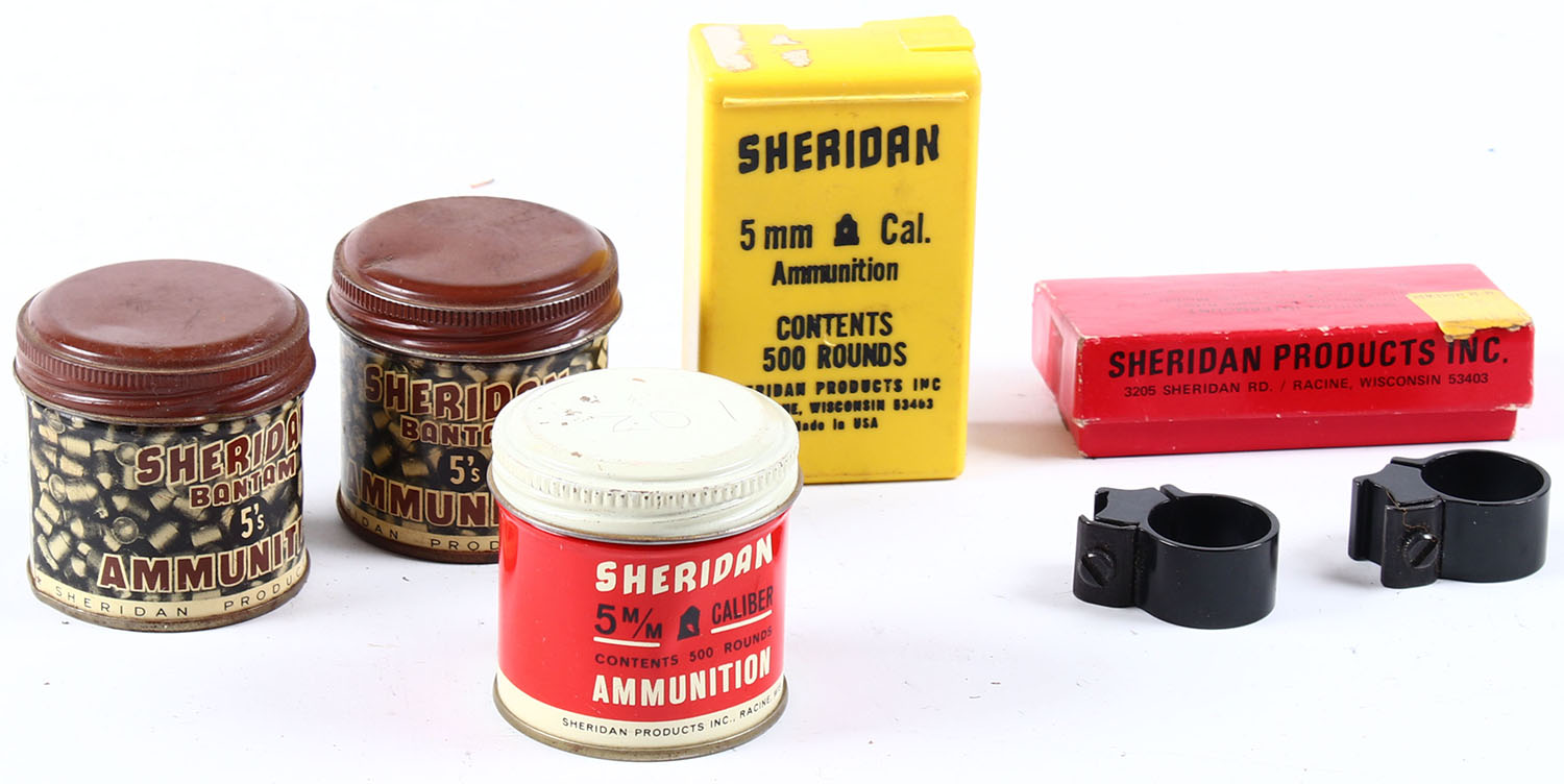 Sheridan, Model C Silver Streak Pellet, CAL: .20 or 5mm, MFG: 1952-63 SN: NA, Pump Pneumatic, 19.5'' barrel. Swinging forearm multi pump pneumatic action. Early variation with the rarer ''hold-down'' automatic safety. The flat pistol grip wood stock is good, but with a couple of edge chips on each side of the forend. There are numerous of minor to small scrapes, scratches & contusions, to the flaking original finish. The metal nickel finish rates excellent. Bore is excellent. Fitted with an adjustable rear sight & blade front sight. Stock manufactured without buttplate. Does not appear to hold compression. Comes with three cans & one plastic box of Sheridan 5mm pellets, a boxed Sheridan tube mountable scope base & scope rings. These seem to be fairly rare & collectible. Overall good. No FFL Req. - Value: 20 to 100