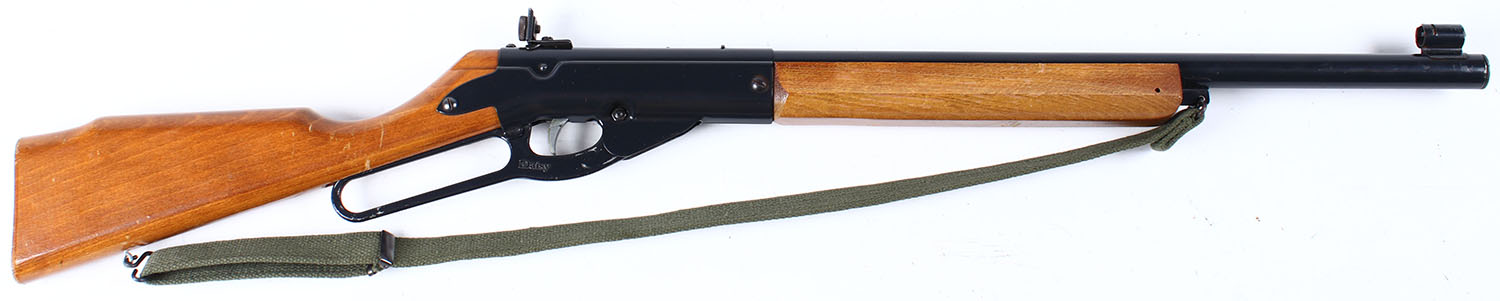 Daisy, Model 99 Target Special, CAL: .175 BB, MFG: 1960's SN: NA, Lever, The straight grip wood stock & forearm are excellent, with a few minor finish level marks to the excellent finish. The metal blue painted finish rates excellent. Metal lever. Fitted with a factory target sights. Stock manufactured without a buttplate. Carries what daisy referred to as a ''web sling''. Comes with five tubes of BB's. Appearance is excellent. No FFL Req. - Value: 30 to 100