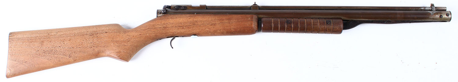 Benjamin Franklin, Model Air Rifle 312 Smoothbore, CAL: .22, MFG: 1940-69 SN: NA, pump, The flat pistol grip wood stock is very good, but without finish. Factory finish on forend. There is a small edge chip at the buttend. The metal nickeled finish has mostly worn away. Fitted with a fixed ''V'' notch rear & blade front sights. Front sight, which also holds barrel to compression tube is loss. Stock manufactured without a buttplate. Left side forend screws missing. No trigger guard. Replaced stock to barrel screw. Does not appear to have compression. A great restoration project. No FFL Req. - Value: 10 to 30