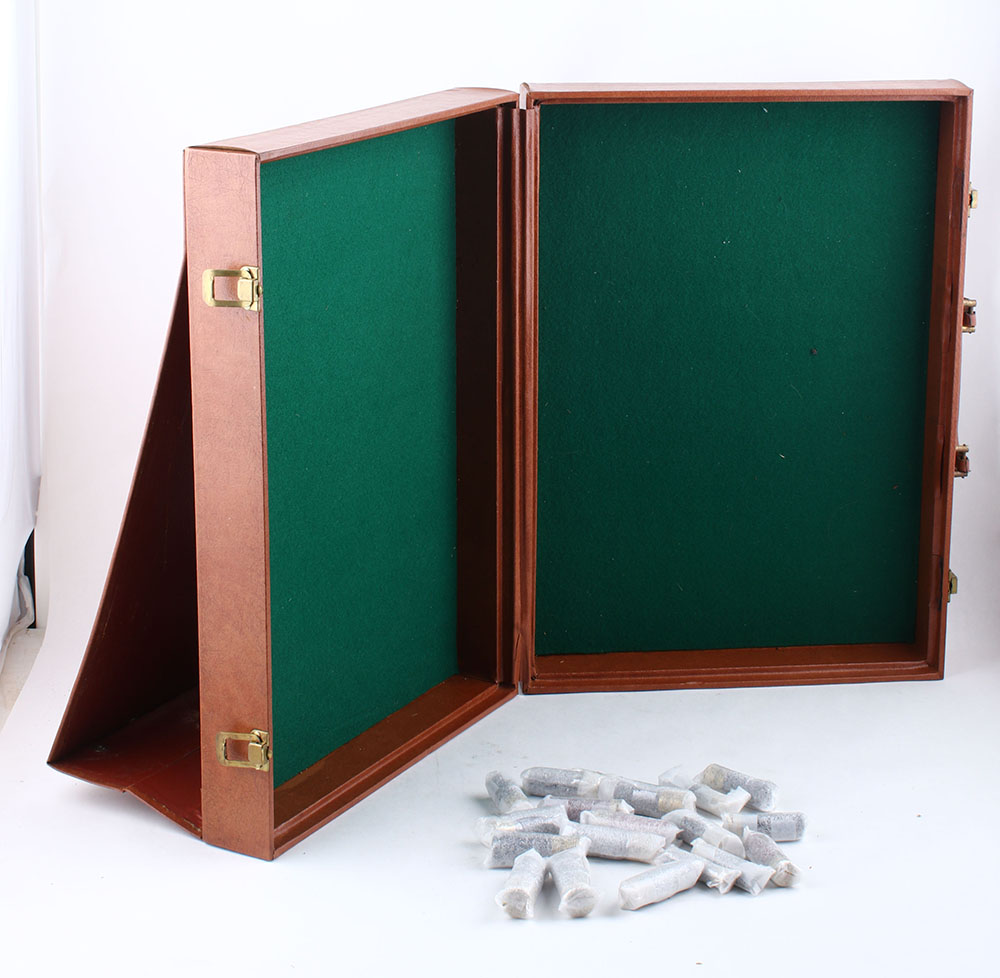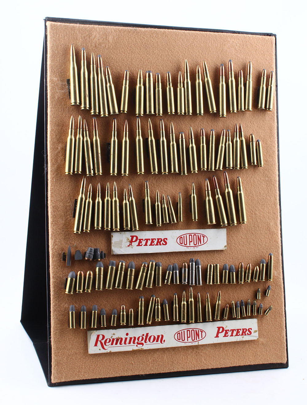RARE! Remington/Peters/Du Pont Salesman Sample Briefcase. Made beginning in 1960, this is a Salesman's Sample Display all fitted in a luggage type case containing all the original dummy ammo as displayed in the pictures. This was used to set up in stores or vendor sales to display various Remington-Peters ammo offerings of the era. The case remains in amazingly great condition with all original contents intact. Case measures 21'' x 15 1/2'' x 5 1/2'' closed. Contents show a bit of scattered shelf soiling. This salesman briefcase has a variety of cartridges including, centerfire, rimfire, shotshells, window shells & bullets. It folds out to display each set individually, or as a whole. Some of the shotshell cartridges still have protective wrapping on them. This is the first time we have seen this set! Former RSA president Roy Marcot believes there was between 12 to 20 Remington field salesmen nationwide at the time & that its possible one was made for each salesman's use. This would likely limit total sets to 20 or less. The briefcase itself is in excellent condition, both inside & out. A wonderful opportunity to own such a rare & complete salesman sample set! * Grade: Excellent + - Value: 4000 to 6000