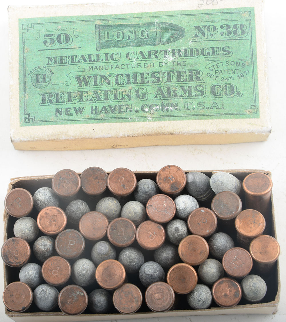 Lot of 50, .38 Rimfire. A mix of .38 Long and short rimfires. Mix of headstamps.by Peters, UMC, Winchester and NHS.(Ethan Allen?). RN Lead. All in a box with a nice reproduction label. Grade Very Good. - Value: 100 to 200