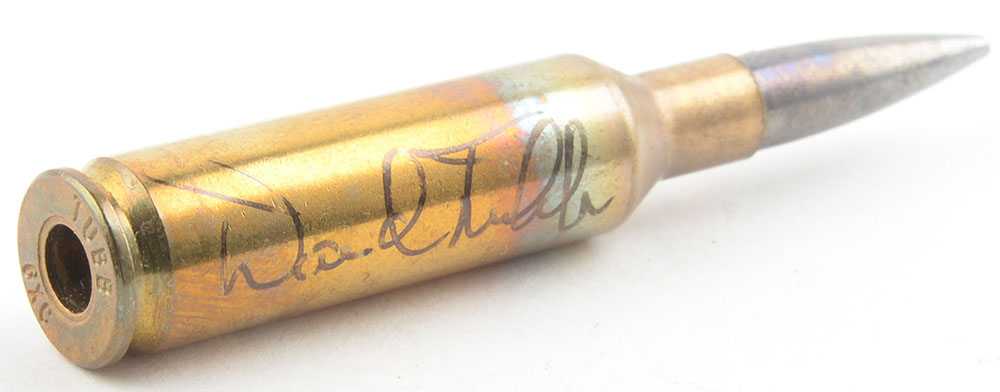 6mm XC Show Cartridge. HS:''TUBB 6XC'', PT moly coated HP. 2005 Southwest Cartridge Show cartridge signed by marksman David Tubb. In Display Case. Grade: Excellent - Value: 20 to 40