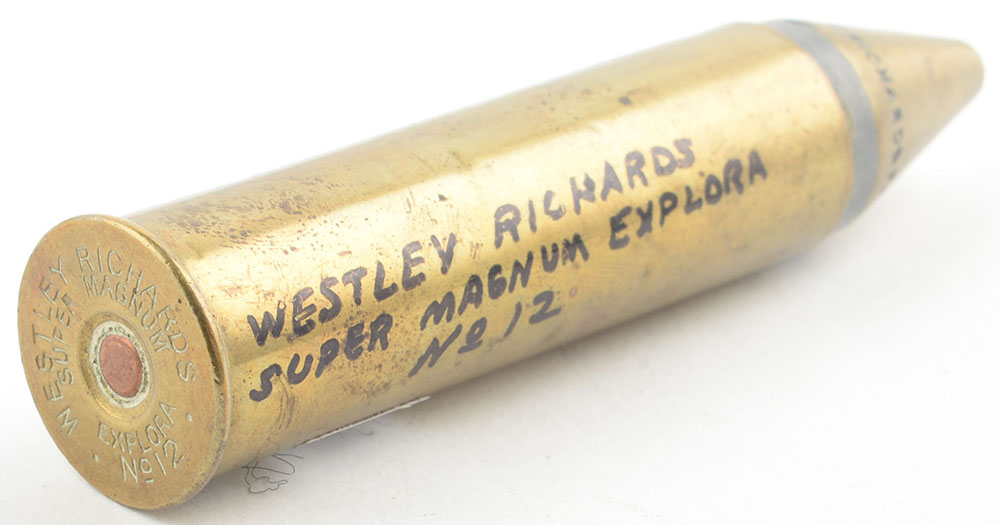 12 Gauge. HS:''WESTLEY RICHARDS SUPER MAGNUM EXPLORA No 12'', LT Capped round with patent number, PT Brass. Grade: Very Good - Value: 40 to 80