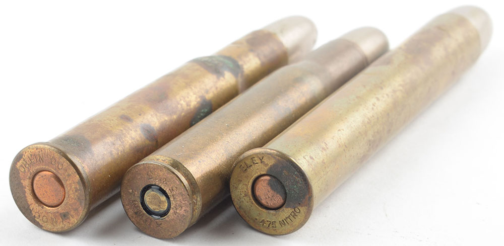 Lot of 3, British Sporting Cartridges. (1) 476 Nitro, HS:''ELEY 476 NITRO'', RN CN SP. (1) 450-400 (3'' case), HS:''KYNOCH 400 NITRO'', RN CN FMJ. (1) 404 Jeffreys (10.75x73mm), HS:''k DWM k 10,75 x 73'', RN CN SP. Grade: Very Good. - Value: 16 to 60