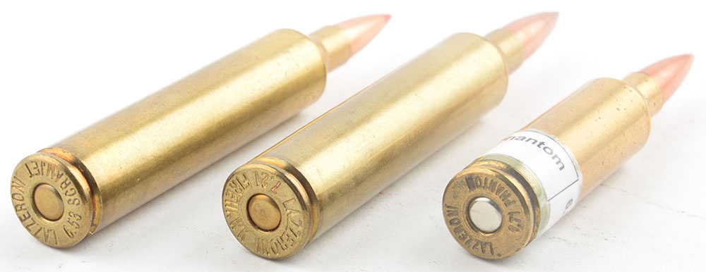 Lot of 3, Lazzeroni Cartridges. (1) HS:''LAZZERONI 7.21 FIREHAWK'', PT CJ Plastic Tip. (1) HS:''LAZZERONI 6.53 SCRAMJET'', PT CJ Plastic Tip. (1) HS:''LAZZERONI 6.71 PHANTOM'', PT CJ FMJ. Grade: Very Good ++ - Value: 20 to 40