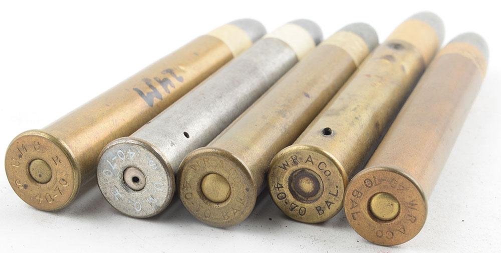 Lot of 5. 540-70 Ballards. (2) HS:''W.R.A.Co. 40-70 BAL'', FN PP Lead. (1) HS:''U.M.C. H 40-70 S'', FN PP Lead. (1) HS:''W.R.A.Co. 40-70 BAL'', FN PP Lead Dummy with two mounting holes and on punch crimp near casemouth to hold bullet. (1) HS:''U.M.C. H 40-70 S'', FN PP Lead Dummy with four small holes at bottom, tinned case and small hole in primer, Scarce. Grade Very Good - Value: 60 to 120