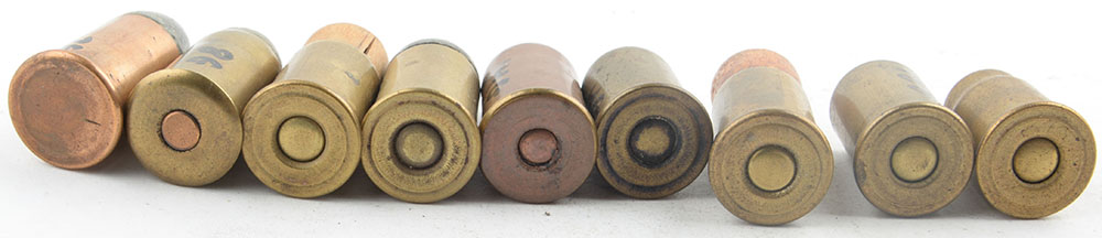 Lot of 9, 50 Remington Navy, al no h/s, (1) Rimfire, (3) Blanks with different mouth crimps, (2) wood sabot shot, (2) live rounds by USSCO (1) by UMC. Grade: Excellent - Value: 150 to 250