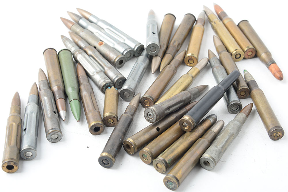 Lot of 33. .30 Sprg. A mixed lot of specialty loadings that consist of the following: (2) 30-03 Sprg, Ball. (15) 30-06 Dummies of various dates. (1) Antenna Ejector. (1) Gallery Mdl 1909. (1) Rolled paper blank. (1) Teflon coated case and bullet. (4) Guard cartridges, late model. (1) Mdl. 1918 Armor Piercing. (1) Mdl 1918 Tracer by Winchester. (2) API with silver colored tips. (3) Frangible rounds with green over white tips. (1) Black Plastic blank. Grade Very Good - Value: 40 to 80