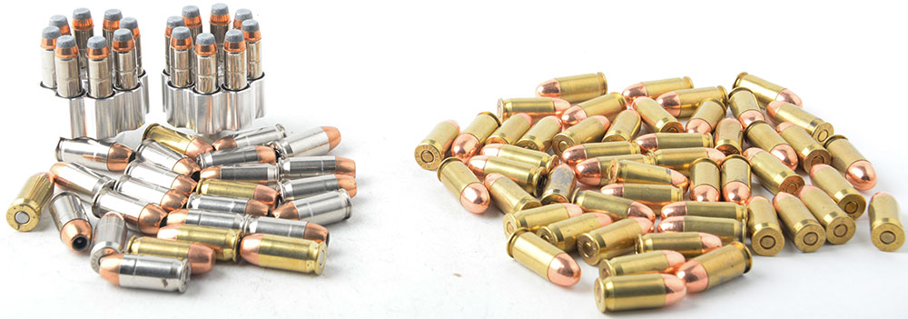 Mixed Lot of Handgun Cartridges. (50) 45 Colt Auto, Mixed headstamps, RN CJ FMJ. (19) .45 Colt Auto by Federal, Hydra-Shocks, (6) .45 Auto by Remington, FN CJ FMJ, (16) .357 Magnum by Federal, FN CJ SP loaded into two 8 shot speed loaders by 5 Star Firearms. - Value: 50 to 100
