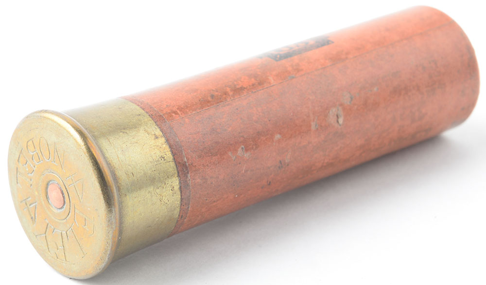 ELEY Nobel, No. 4ga, 3 3/4'' OAL. Gastight Quality Case, Loaded red paper case with printing, TW BB. Grade: Excellent - Value: 50 to 200