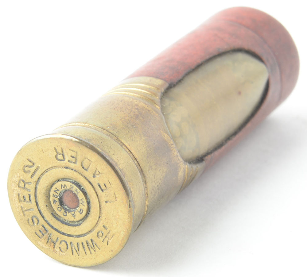 Window Shell, H/S= ''Winchester No 12 Leader'', 2 1/2'' OAL, salesman sample in red paper case. Grade: Very Good ++ - Value: 10 to 80