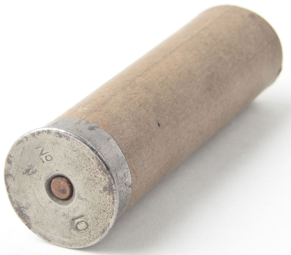 10ga NPE, tan paper case, 3'' OAL. Grade: Very Good ++ - Value: 10 to 50