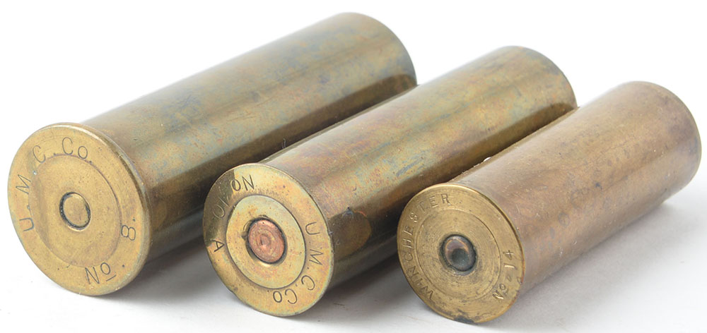 RARE! Lot of 3 empty brass shotshells, UMC 8 ga and 10 ga and Winchester 14 ga. Grade: Excellent + - Value: 40 to 100