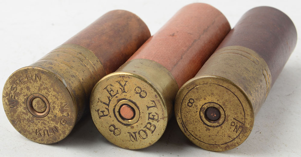 | Lot of 3, 8 Ga. & Kiln Gun, paper shotgun shells. Grade: Very G...