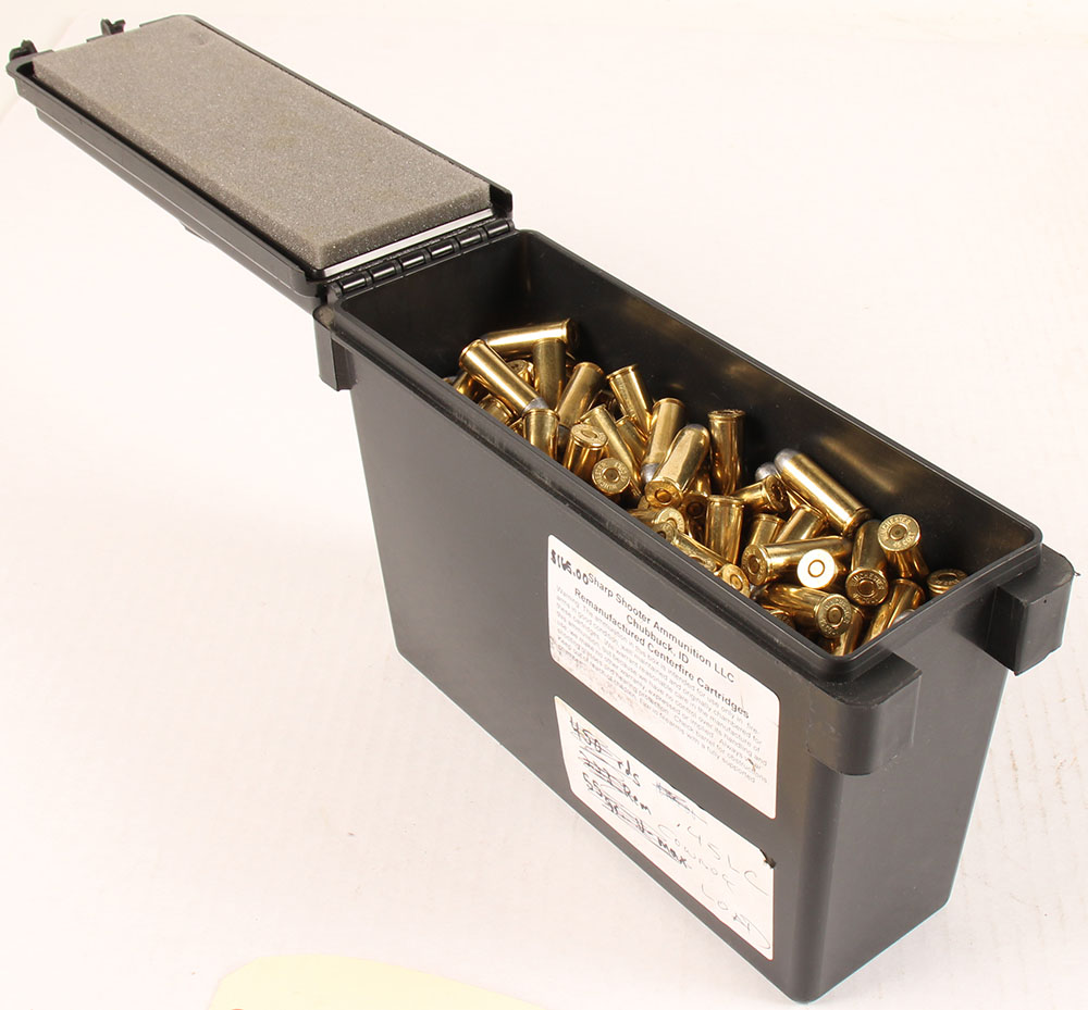 Plastic .30 Cal sized ammo can filled with Approx. 250 Rds. Of Winchester .45 Long Colt Cowboy loads, lead wound bullet with flat point, ammo is excellent. Grade: Excellent + - Value: 100 to 250
