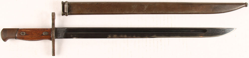 Japanese, Type 30 Bayonet with sheath, left side of ricasso marked with a ''K'' in star logo next to the Nagoya Arsenal logo, this is a unknown company that made bayonets under Nagoya inspectors' supervision, straight guard. Smooth wood grips. Blued blade with sheath wear near edge, the guard & pommel have toned to a brown patina. The steel sheath has also mostly toned to a brown patina with some cleaned pitting scars. Grade: Very Good ++ - Value: 40 to 80