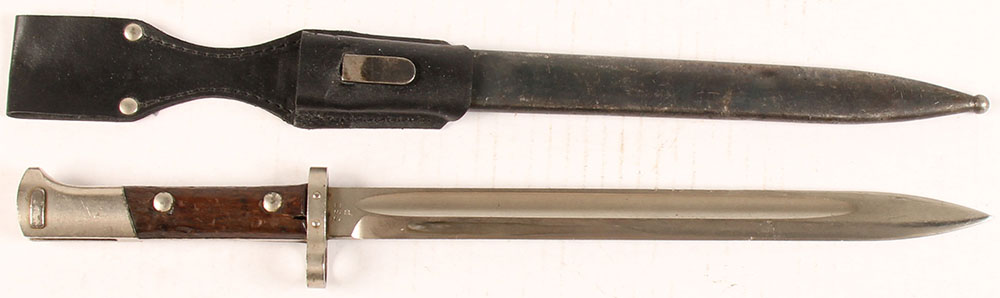 Czech, Zbrojovka Brno, VZ-24 Bayonet with sheath & frog. The Ricasso is marked ''CSZ'' over ''P'', right side of pommel marked ''9339'' over ''A''. Blade has been cleaned from rust & has light roughness across it. Blade has been sharpened & has sheath wear. Smooth wood grips has dings & dents from use. Blued steel sheath has some thinning & scratches. Black leather frog with no markings. Grade: Excellent + - Value: 40 to 80
