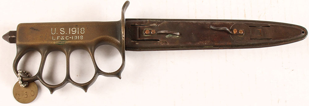 CONDITION: Right side of the handle is marked ''U.S. 1918'' over ''L.F & C-1918''. Has a brass hang tag stamped ''150''. Blued steel blade, has sheath/use wear & scratches but retains about 40% of its blue, does have some light scattered roughness at the tip & ricasso. Cast bronze handle that was chemically blackened. Some the blackened finish has worn away in common handling areas showing the bronze color underneath, thinned blacked finish remains in protected areas around the guard & knuckle holes. Steel nut on the pommel that holds blade in place has some small scuffs & starting to tone brown. the steel sheath is marked ''L.F.&C.'' over ''1918''. One side of sheath has complete toned brown, the other side is a mix of gun metal gray with speckled brown patina. Grade: Very Good ++ - Value: 1000 to 2000