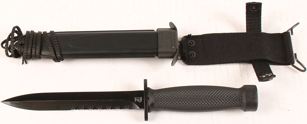 German, Eickhorn Solingen, modern, Recon Force knife & Sheath & hanger. Mat black finish, black plastic checkered grips, ricasso marked with the Eickhorn Solingen squirrel logo. Sheath is marked ''US M8A1'', ''Made In Germany'', nylon hanger, & has a leg tiedown string. Grade: Excellent ++ - Value: 50 to 100