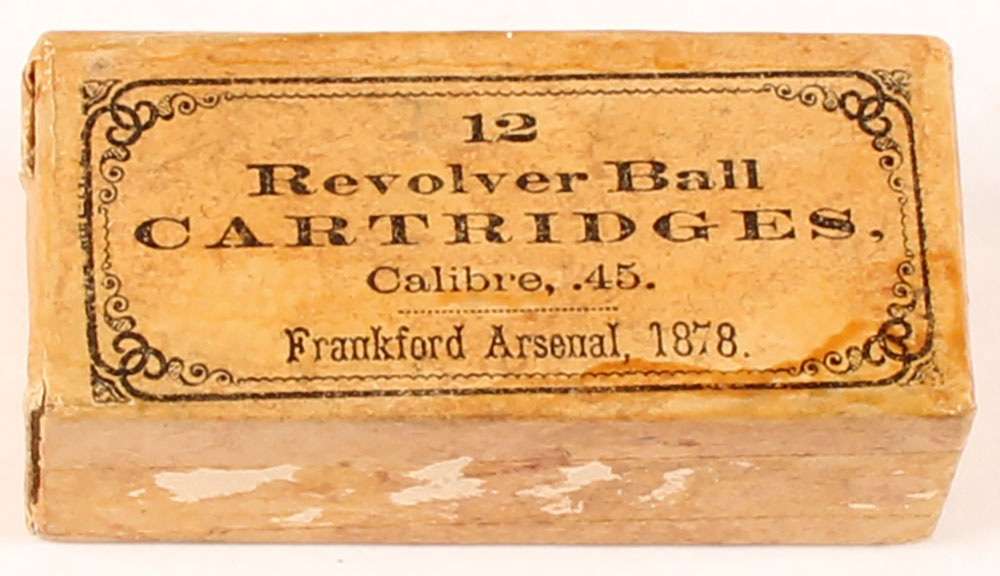 RARE!! Frankford Arsenal, Cal .45 Revolver Ball Cartridges, dated 1878, 1pc, Full & sealed with seam splits. Buff box & label with black print, box covered in original protective lacquer. The box has splits on the top side, bottom seam, left end rear & bottom seam, partial seam split on the right end top seam. Box has rub wear on sides & light rub wear the top label & on the edges/corners. Grade: Very Good ++ - Value: 100 to 300