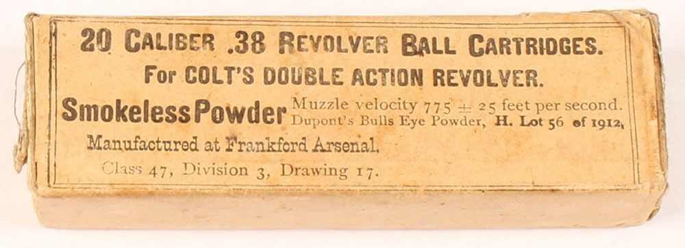 Frankford Arsenal, .38 Revolver Ball, for colts double action revolver, smokeless, date stamped ''1/14'', FULL & SEALED, buff box & label with black print. The box has light age soiling, light rub wear on sides & edges/corners, & faint bullet indents on bottom. Grade: Excellent - Value: 40 to 120